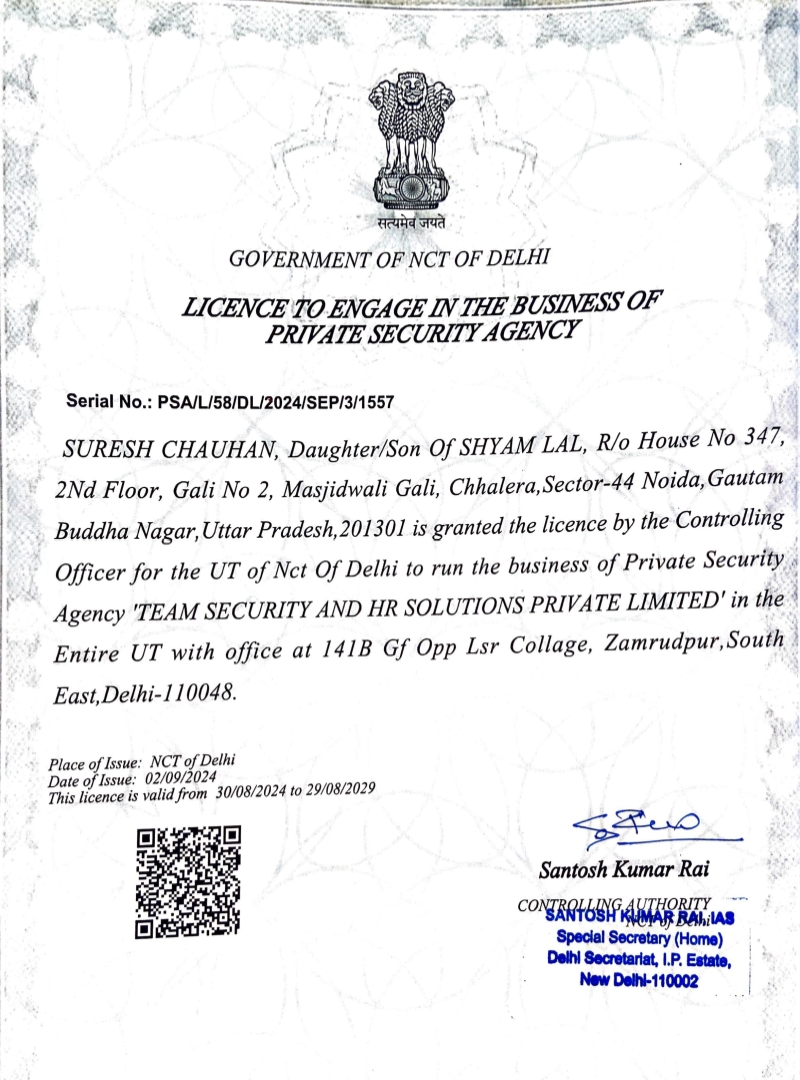 At Team Security & HR Solutions Private Limited, we are dedicated to delivering flawless security, cleaning, and HR solutions tailored to your specific needs. Our team consists of highly trained professionals who excel in their respective fields. We are ISO 9001:2008 certified and registered under the ‘Delhi Private Security Agency Regulation 2009’, ensuring the highest standards of service and compliance.